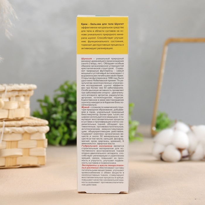 Шунгит - эффективное натуральное средство для тела в области суставов на основе уникального природного минерала шунгит. Шунгит стимулирует восстановительные процессы в суставах и пролиферацию клеток соединительных тканей, обладает противоотечным, противовоспалительным, антитоксическим, иммуностимулирующим, общеукрепляющим действием. Он способствует улучшению функционального состояния, тормозит деструктивные процессы и активизирует регенерацию. Его действие и эффективность крема бальзама Шунгит для тела в области суставов обеспечены высокой биологической активностью и синергизмом его компонентов. Гидролизат коллагена способствует регенерации и укреплению хрящей, связок, повышает их прочность и упругость, улучшает подвижность суставов и позвоночника. Женьшень повышает жизненный тонус организма, замедляет возрастные изменения, активно препятствует старению опорно-двигательного аппарата.