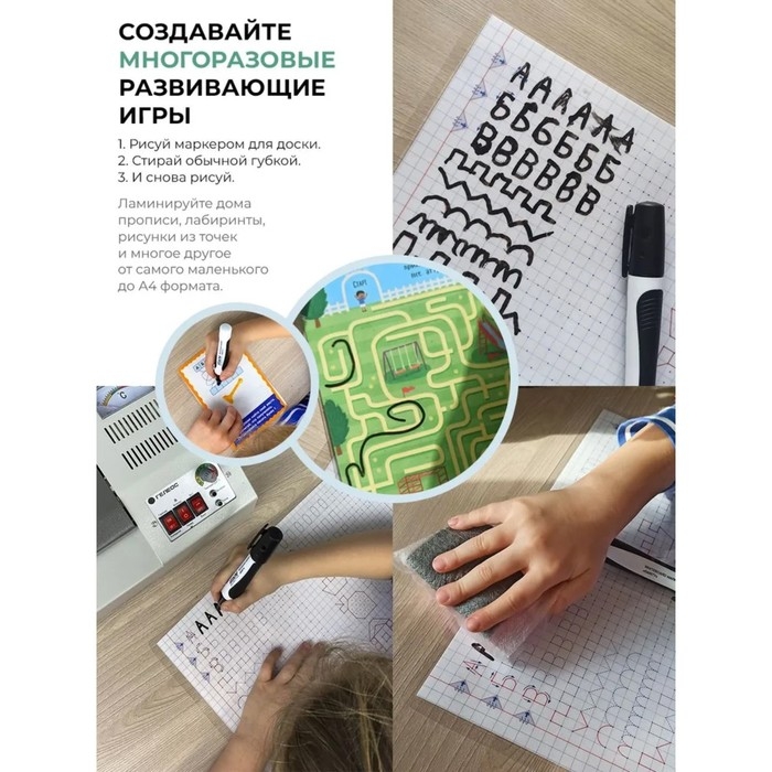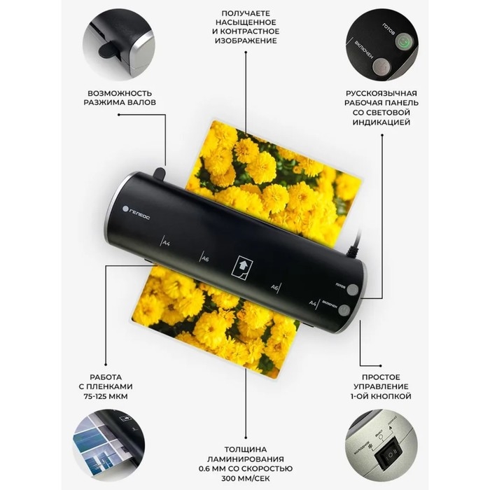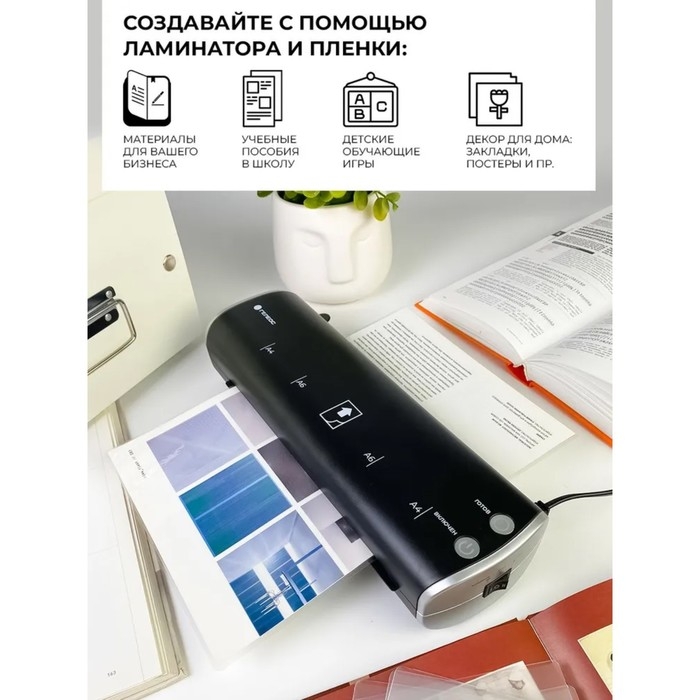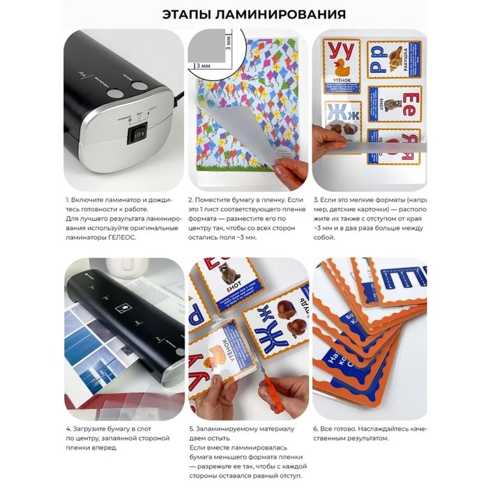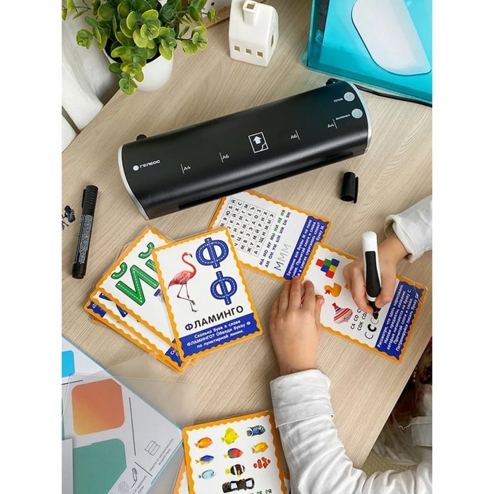 Ламинатор отлично подходит как вариант подарка на день рождения, новый год, так как его можно использоваться для работы с печатной продукцией в офисе, в школе или в детском саду. А также прекрасно подходит для творчества, для создания настольных или развивающих игр и учебных пособий. Аппарат для ламинирования сертифицирован и безопасен для использования. Для лучшего результата ламинирования используйте оригинальную пленку ГЕЛЕОС.