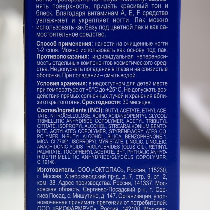 Состав: butyl acetate, ethyl acetate, nitrocellulose, adipic acid/ neopentyl glycol/trimellitic anhydride copolymer, acetyl tributyl citrate, isopropyl alcohol, strearalkonium bentonite, acrylates copolymer, styrene/ acrylates copolymer, n-butyl alcohol, silica, benzophenone-1, mica, ci 77491, isopropyl myristate, linolic acid, linoleic acid, arachidonic acid, triglycerides (olus oil), retinyl palmitate, tocopheryl acetate, bht.