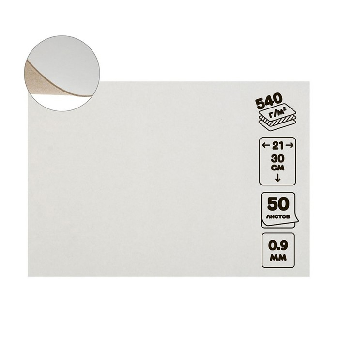 Картон переплётный 0.9 мм, 21 х 30, 50 листов, 540 г/м², белый