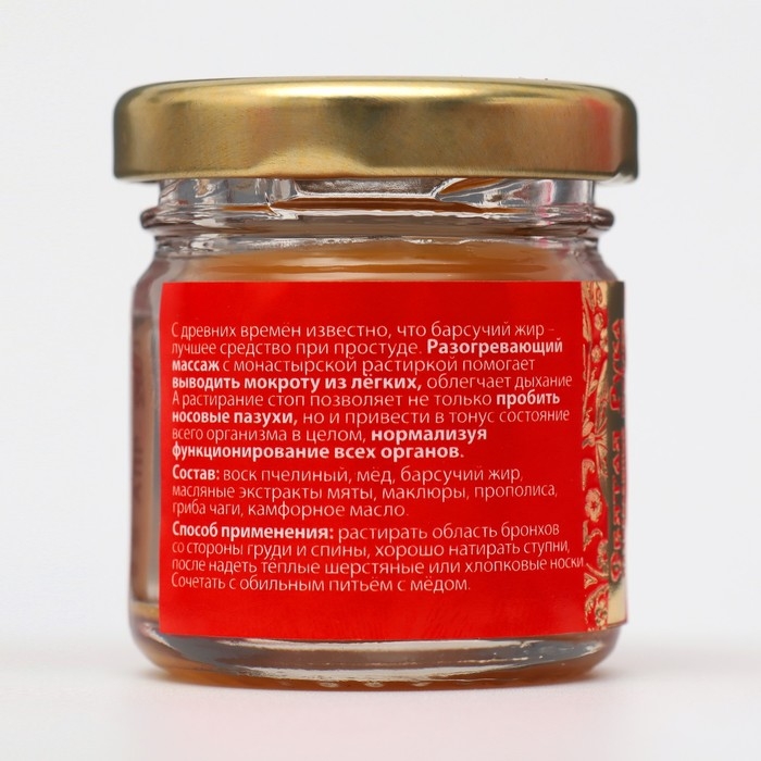 Состав: воск пчелиный, мёд, барсучий жир, масляные экстракты мяты, маклюры, прополиса, гриба чаги, камфорное масло.