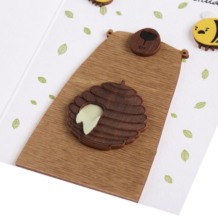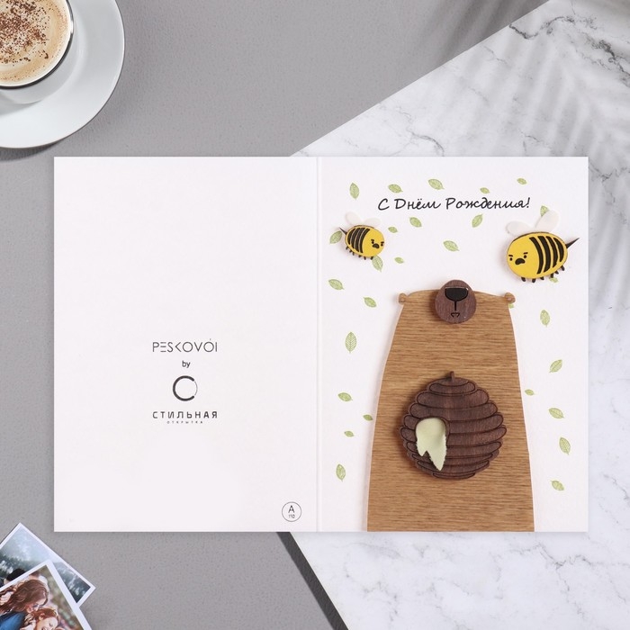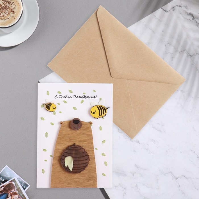 Открытка с деревянным элементом "С Днем Рождения!" ручная работа, мед, пчелы, 14,7х10,5 см
