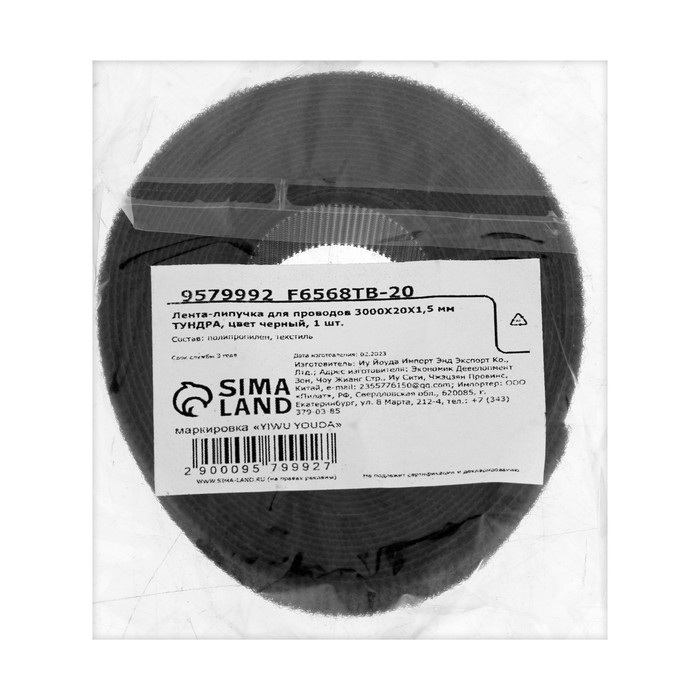 Лента-липучка для проводов 3000Х20Х1,5 мм ТУНДРА, цвет черный, 1 шт.