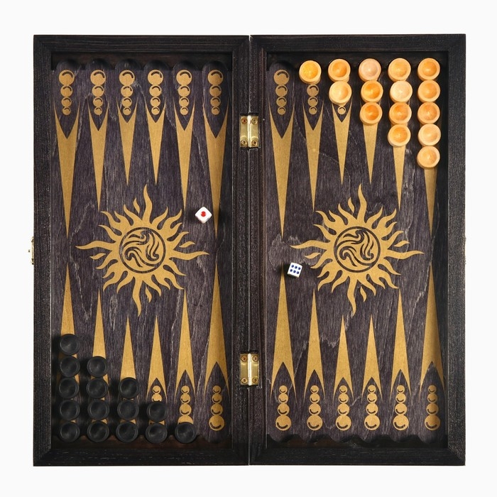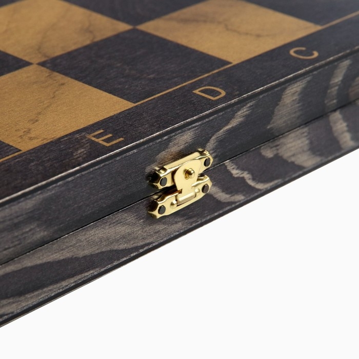Деревянная доска выполнена из хвойных, лиственных пород и покрыта лаком для комфортной эксплуатации игрового поля, методом морения покрыта благородным чёрным цветом, а рисунок золотого цвета внутри доски выполнен в технике шелкография. Размер доски в разложенном виде 40 х 40 см. Доска имеет аккуратную и надежную фурнитуру и вместительный отсек для хранения. Фигуры, фишки и шашки, покрытые лаком, приятно и удобно держать в руке. Они выполнены из дерева, имеют привлекательный внешний вид и длительный срок службы.