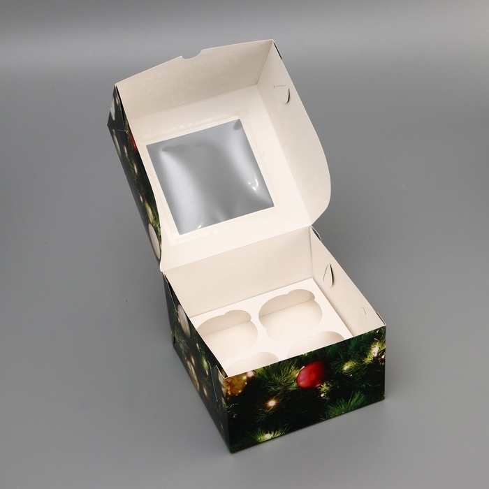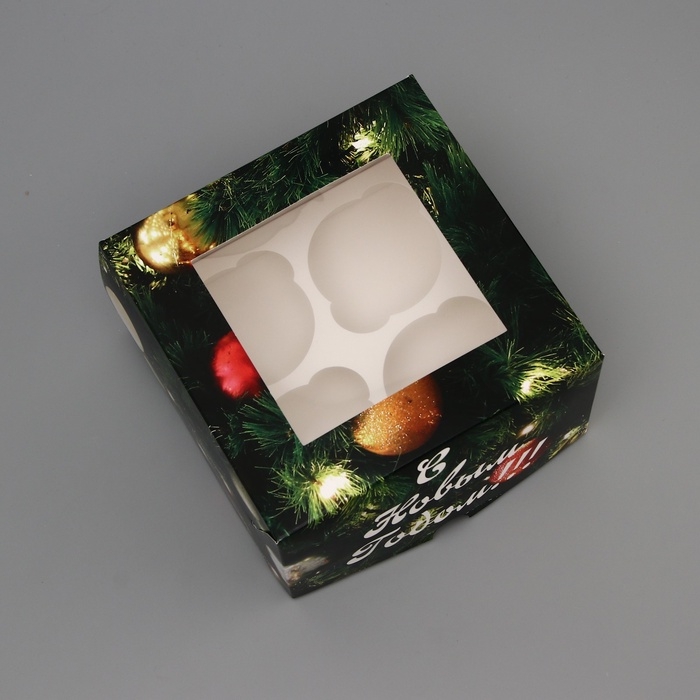 Коробка для 4 капкейка с окном "Счастливого рождества", 16 х 16 х 10 см, упаковка, Новый год