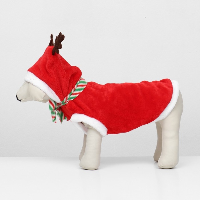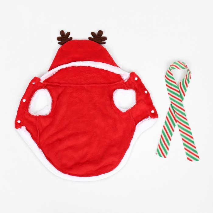 Костюм "Новогодний с рожками" из мягкого флиса с капюшоном, полосатым шарфиком и удобными клепками на животе - это чудесный праздничный наряд, который добавит волшебства и радости в жизнь вашего пушистого друга. Изготовлен из мягкого флиса, что позволяет надевать костюм в прохладную погоду или просто дома.