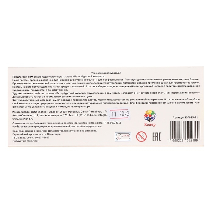 Состав пастели "Петербургский колорит" это натуральные пигменты, природные наполнители, антисептики. Соответствует требованиям таможенного регламента Таможенного союза ТР ТС 007/2011 "О безопасности продукции, предназначенной для детей и подростков".