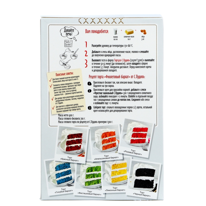 При создании торта «Фиолетовый бархат» мы вдохновлялись передовыми трендами в мировом кондитерском искусстве. Солнечный, привлекающий внимание торт с пористыми бисквитами, буквально тающими во рту, словно бы сделан в дорогой кондитерской. Ваши близкие и гости обязательно так подумают, когда его увидят на столе. При этом приготовить выпечку с гарантированным результатом сможет каждая хозяйка. Мы высчитали все пропорции ингредиентов, вам останется только объединить их, выложить готовое тесто в форму и испечь, согласно инструкции. Украсьте готовый торт ванильным фростингом от «С.Пудовъ» или своим любимым кремом.