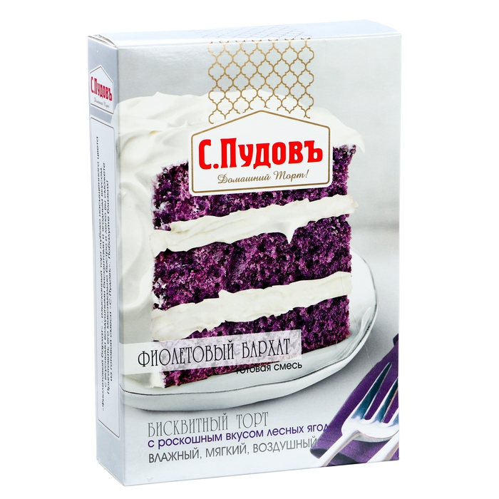 «Фиолетовый бархат» - изысканный торт глубоко насыщенного цвета с вкусными воздушными бисквитами и ягодным вкусом. Приготовить его максимально быстро и легко вы сможете из готовой смеси «С.Пудовъ».