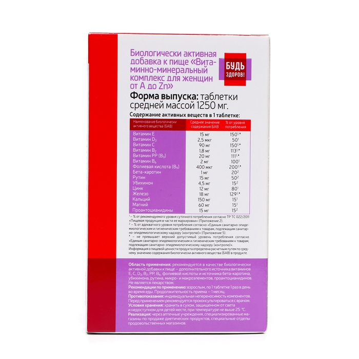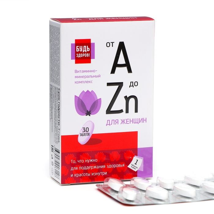 Витаминно-минеральный комплекс "Будь Здоров!" для женщин от А до Цинка - это препарат, который содержит комплекс витаминов и минералов, необходимых для поддержания здоровья и красоты женщин. Он упакован в удобные таблетки, всего в упаковке 30 штук.