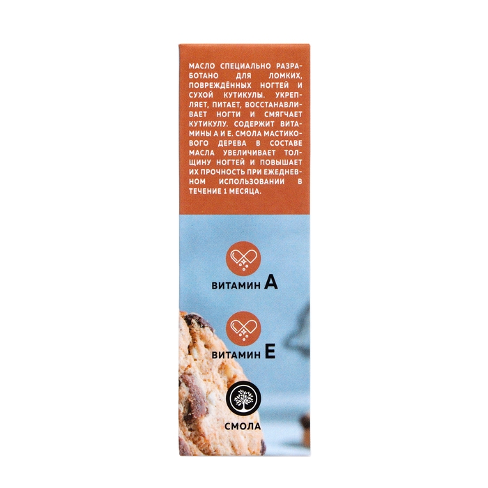 Быстро впитывается, оставляет приятное ощущение и сладкий аромат сливочного печенья. Содержит витамины А и Е. Смола мастикового дерева в составе масла увеличивает толщину ногтей и повышает их прочность при ежедневном использовании в течение 1 месяца. Рекомендовано для ломких, повреждённых ногтей и сухой кутикулы.