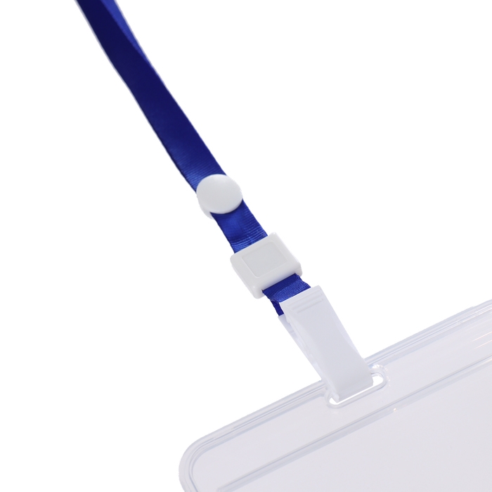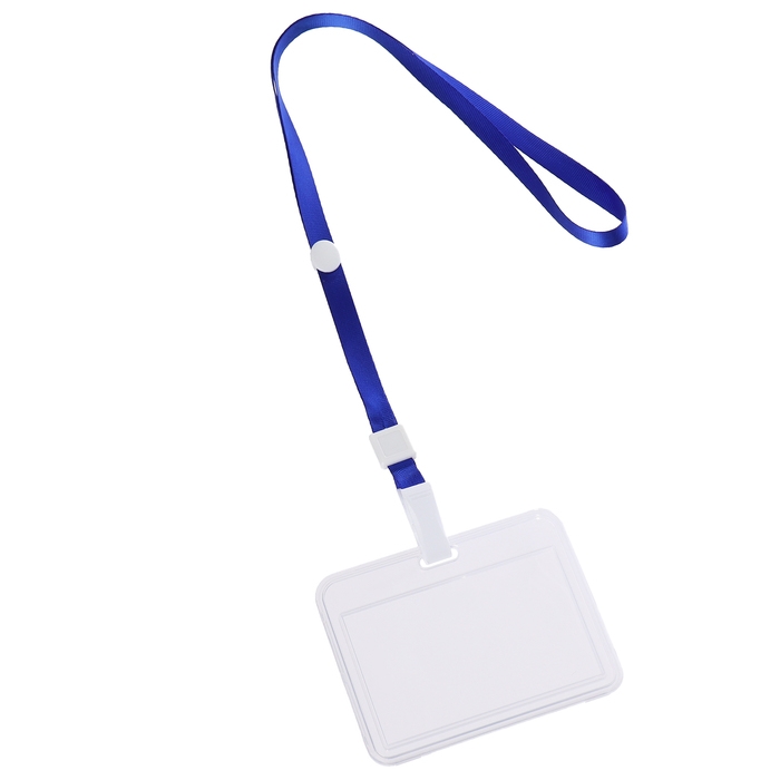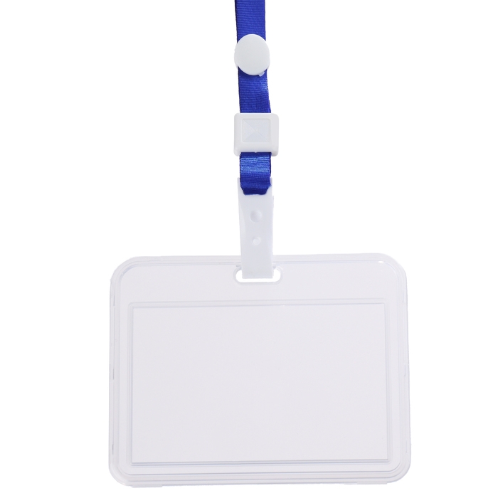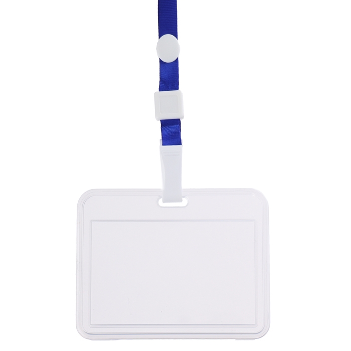 Бейдж-карман горизонтальный пластиковый, внешний 100x68мм, внутренний 85x54мм, лента 80x1,2см, синий.