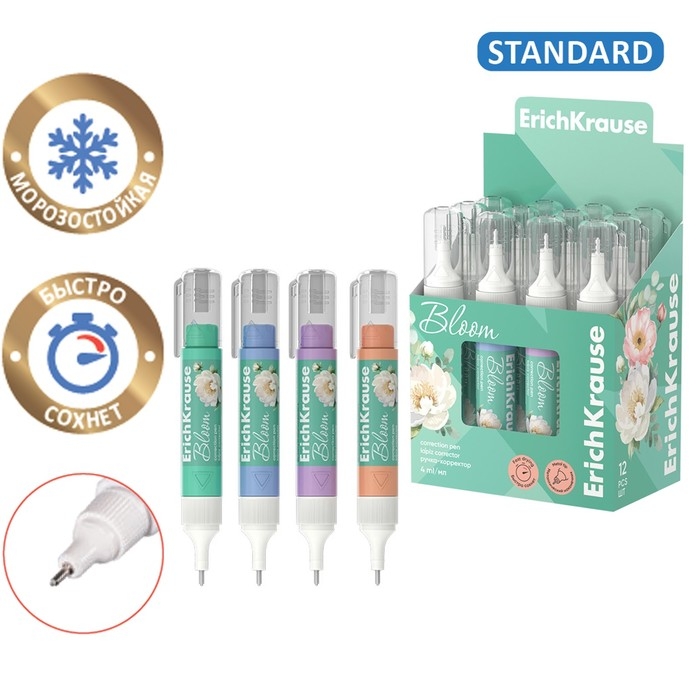Ручка-корректор 4 мл, ErichKrause Pastel Bloom, с металлическим наконечником, экономичный расход, на основе растворителя, МИКС
