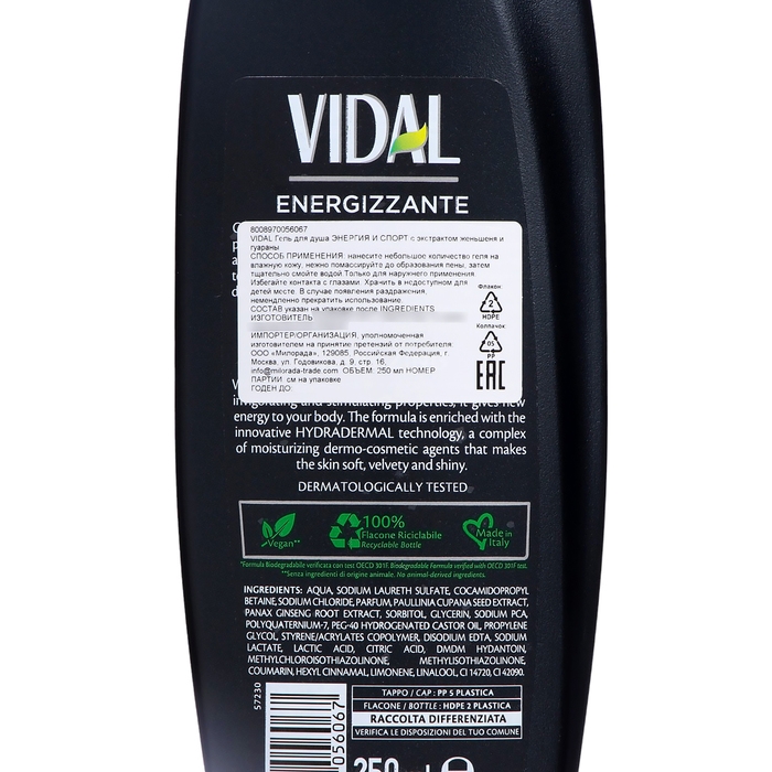 Гель для душа VIDAL с экстрактом женьшеня и гуараны, 250 мл