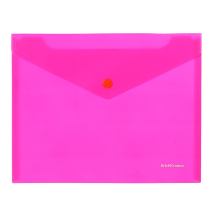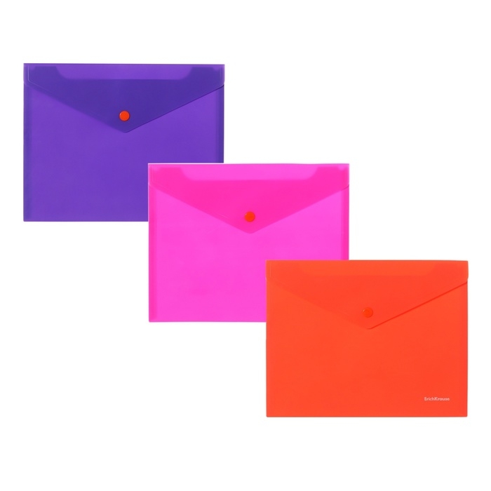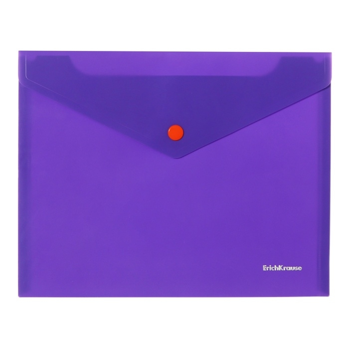 Папка-конверт на кнопке формата А5+ из высококачественного непрозрачного пластика с текстурой поверхности "софт-тач" на которой не видно отпечатков пальцев и мелких царапин. Предназначена для хранения и транспортировки небольшого количества документов. Цвет папки - ассорти: маджента, оранжевый, фиолетовый. Надежная застежка-кнопка обеспечивает быстрый доступ к документам. Размер - 240x191мм, толщина - 0.18мм. Штрих-код на каждой единице товара.
