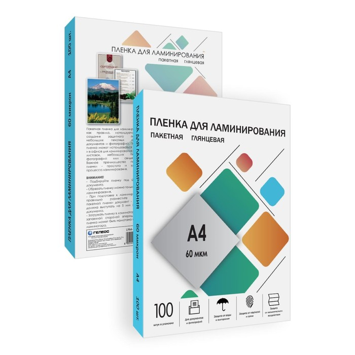 Пленка для ламинирования A4 216х303 мм, 100 мкм, 100 штук, глянцевые, Гелеос