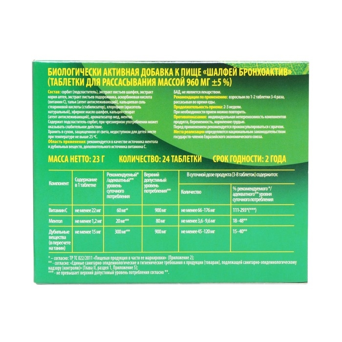 Шалфей Бронхоактив — это биологически активная добавка к пище, содержащая источник ментола и дубильных веществ, а также дополнительный источник витамина С.