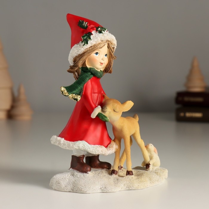 Сувенир полистоун "Девочка в красном с оленёнком" 10х6х13 см