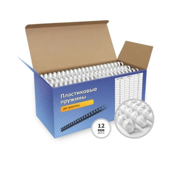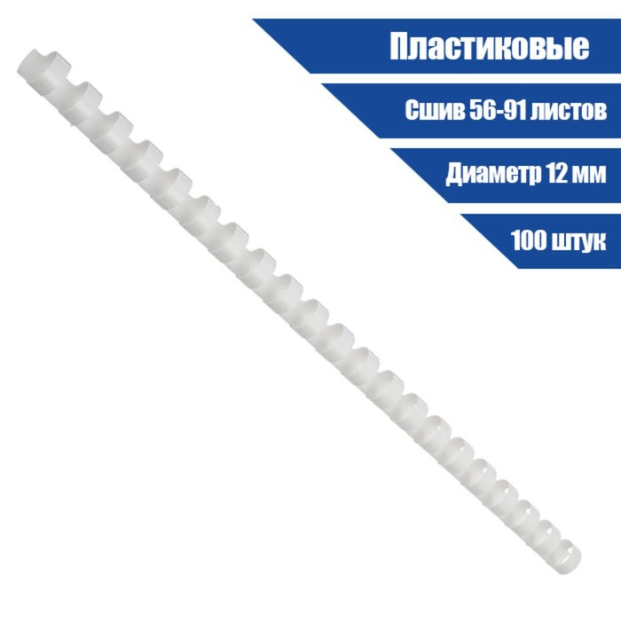 Пружины для переплета пластиковые, d=12мм, 100 штук, сшивают 56-91 лист, белые, Гелеос
