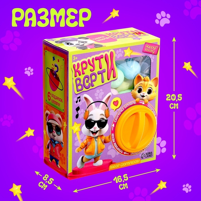 Набор «Крути-верти. Питомцы» — это целый мир миниатюрных животных, готовых стать верными спутниками ребёнка. Внутри набора вас ждут 6 сюрпризов. Покрутите специальную ручку и узнайте, какой милый питомец спрятался внутри.