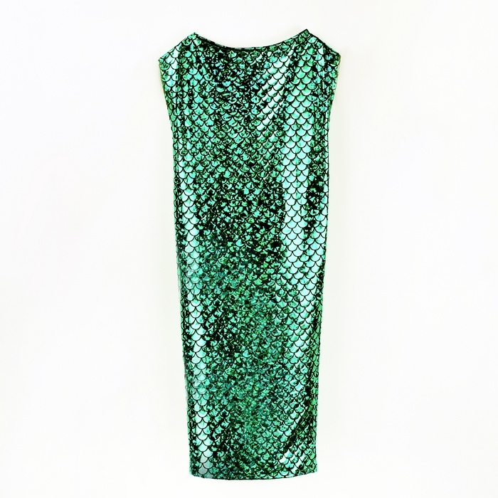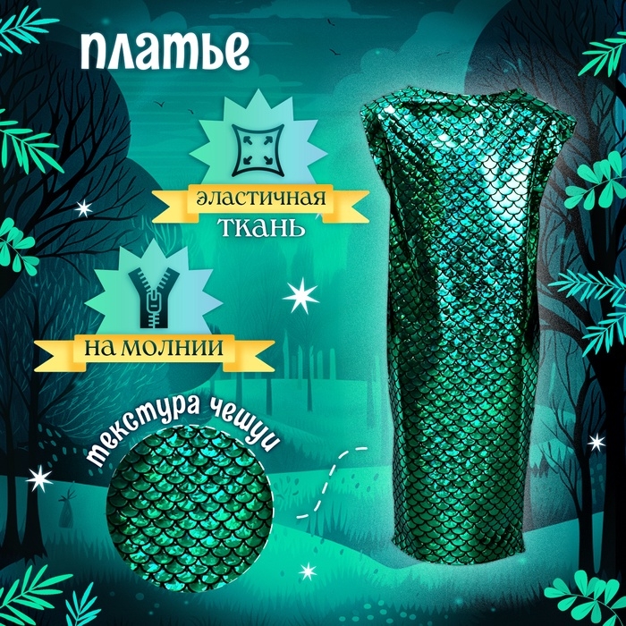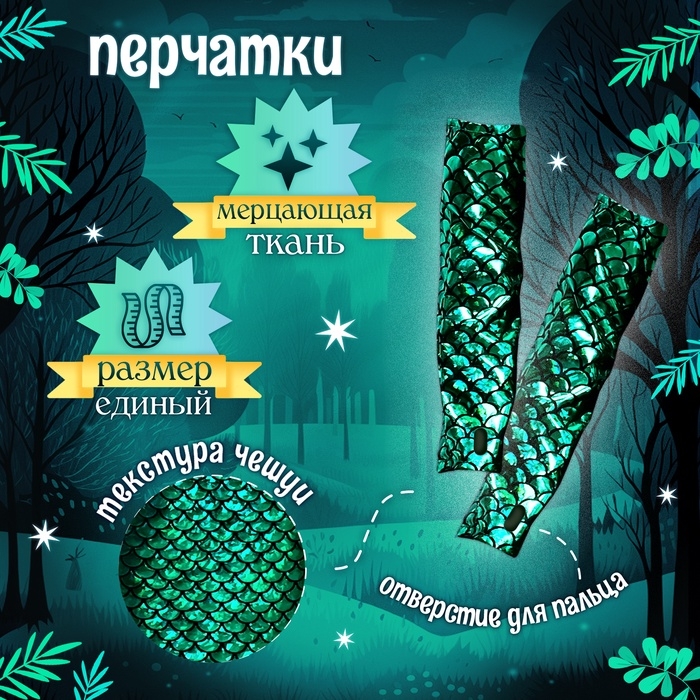 - Перчатки: блестящие зелёные перчатки в тон платью украшены рисунком чешуек. Они добавят образу завершённости и загадочности.