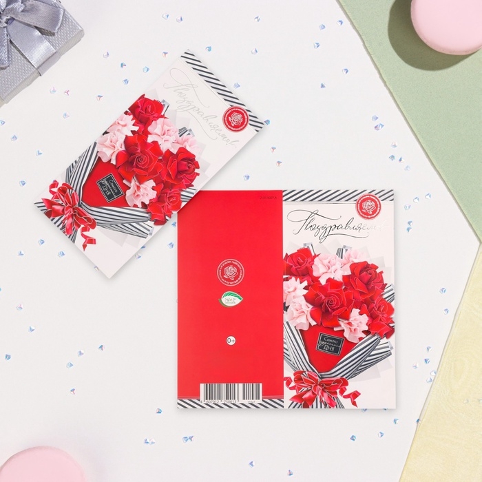 Открытка-евро "Поздравляем!" конгрев, тиснение, красный цветы, 10,5 х 21,5 см