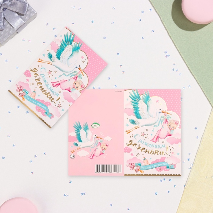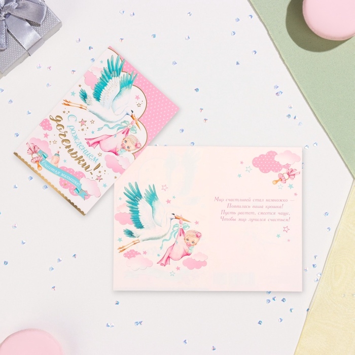 Открытка "С рождением доченьки!" конгрев, тиснение, аист, 12,5 х 19,4 см