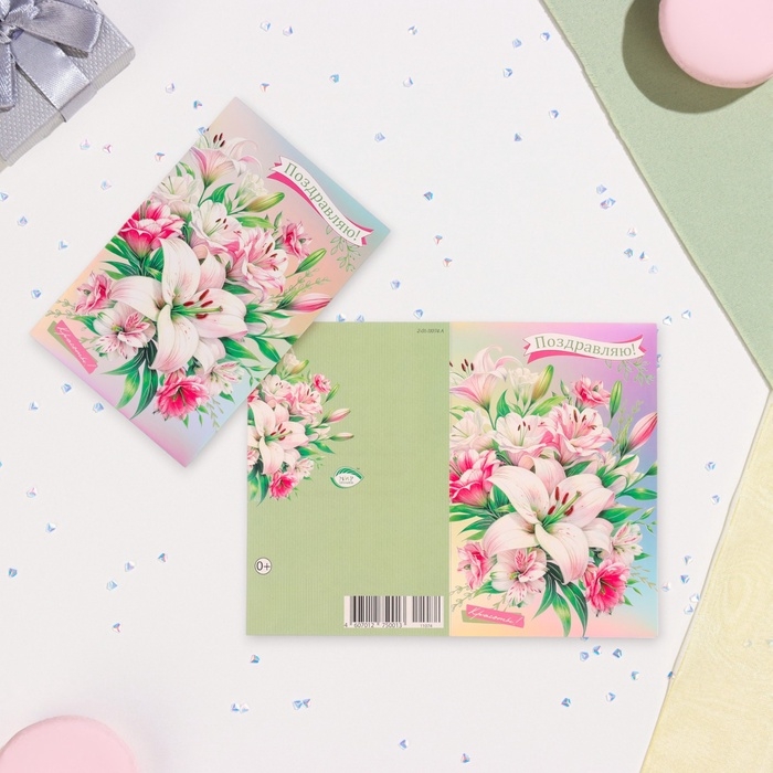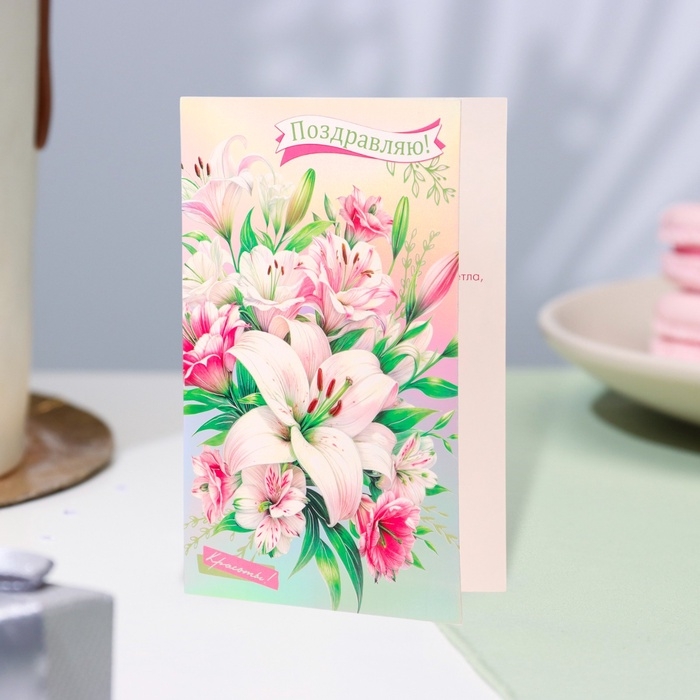 Открытка "Поздравляю!" конгрев, тиснение, лилии, 12,5 х 19,4 см