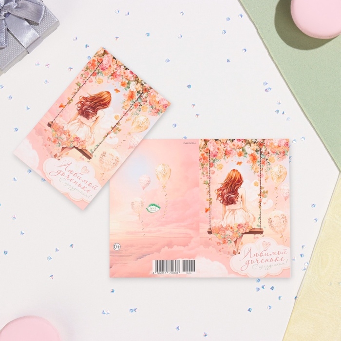 Открытка "Любимой доченьке!" глиттер, конгрев, качели, 12,5 х 19,4 см