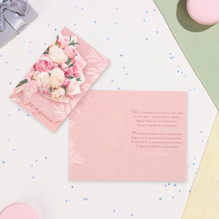 Открытка "С Днём Рождения!" глиттер, конгрев, розовый фон, букет, 12,5 х 19,4 см