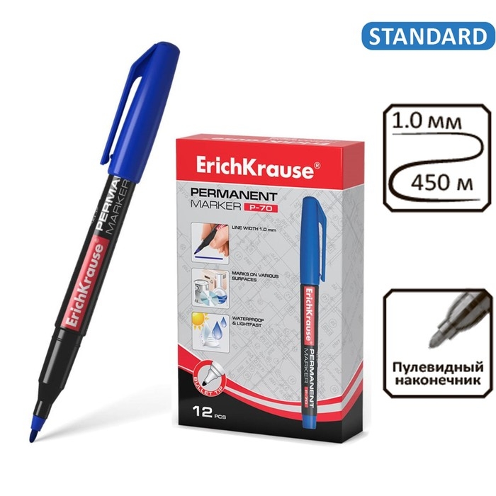 Маркер перманентный ErichKrause P-70, 1.0 мм, для письма на любой поверхности, синий