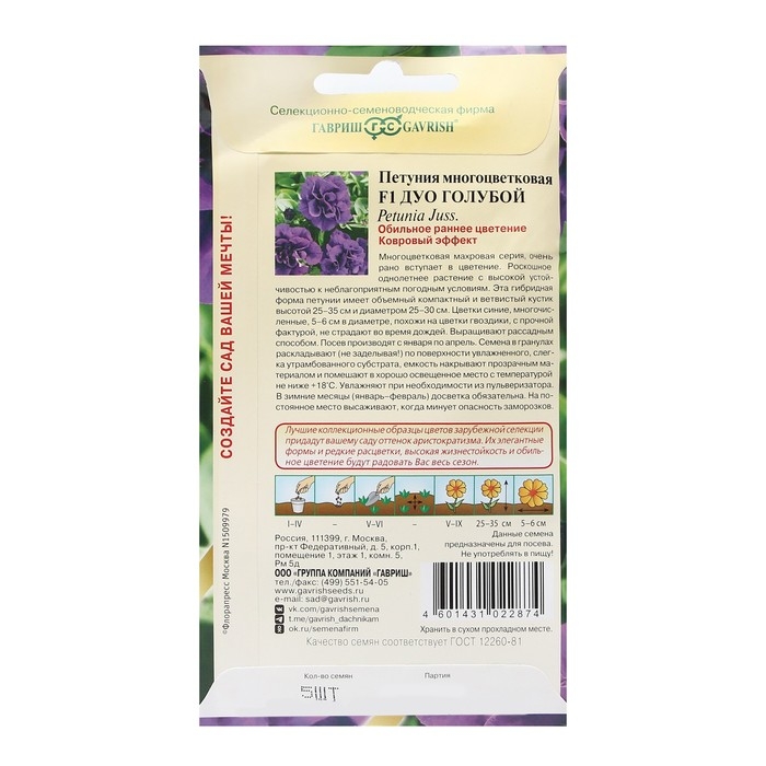 Семена цветов Петуния "Дуо", голубой F1 махровая, О, гранулы, пробирка, 5 шт.