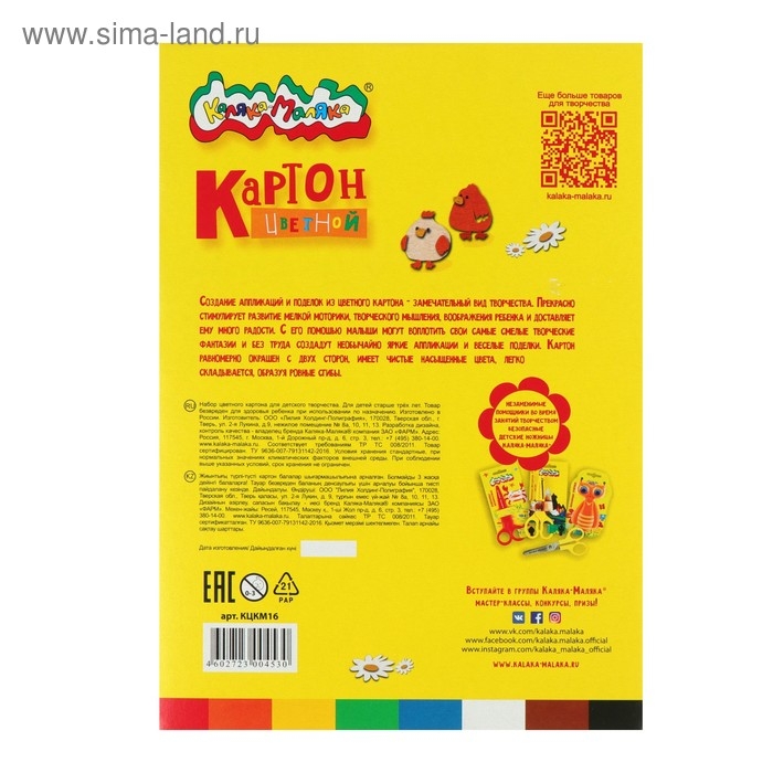Картон цветной А4, 16 листов, 8 цветов "Каляка-Маляка", немелованный, односторонний