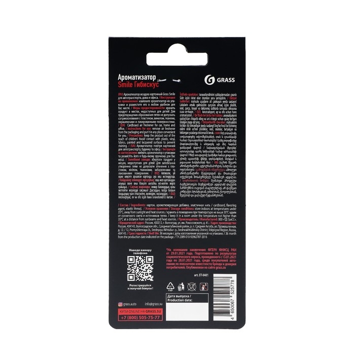 Ароматизатор Grass “Смайл” с ароматом гибискуса представляет собой компактный картонный подвесной блок с перфорированной поверхностью. Он предназначен для установки в автомобиле, офисе или любом другом помещении, чтобы создать приятную атмосферу и наполнить воздух нежным ароматом ванили.