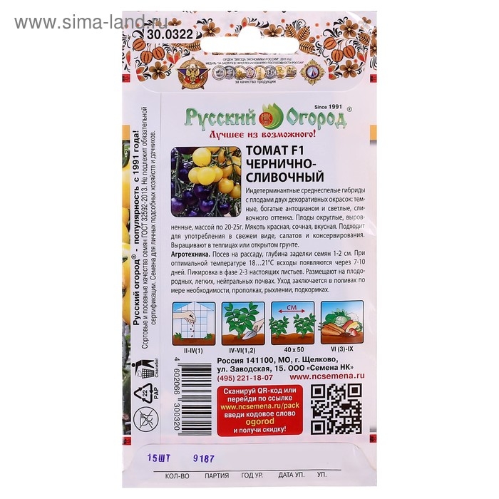 Семена Томат "Чернично-сливочный" смесь F1, серия Русский огород, 15 шт