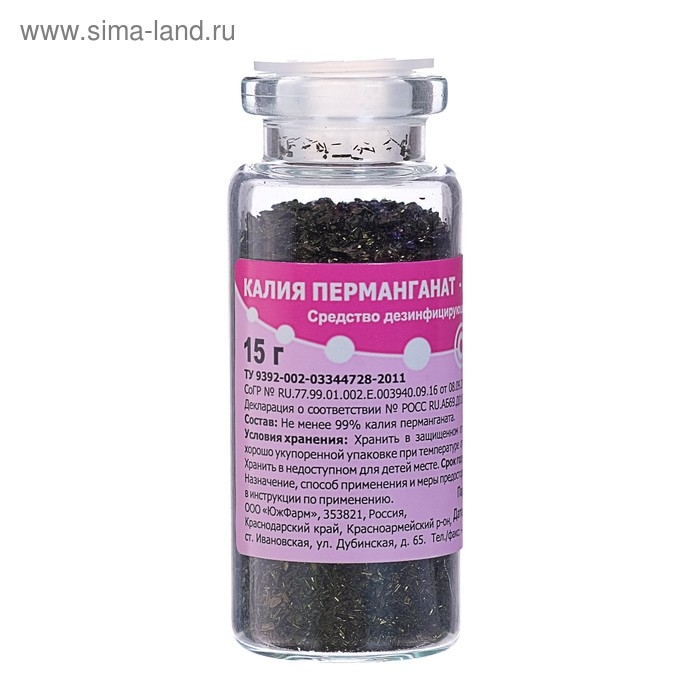 «Калия перманганат - ЮжФарм» представляет собой кристаллы темно-фиолетовые или красно-фиолетовые или мелкий кристаллический порошок с сине-стальным блеском.