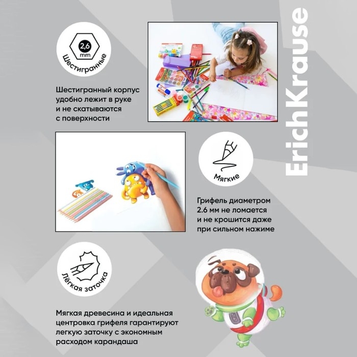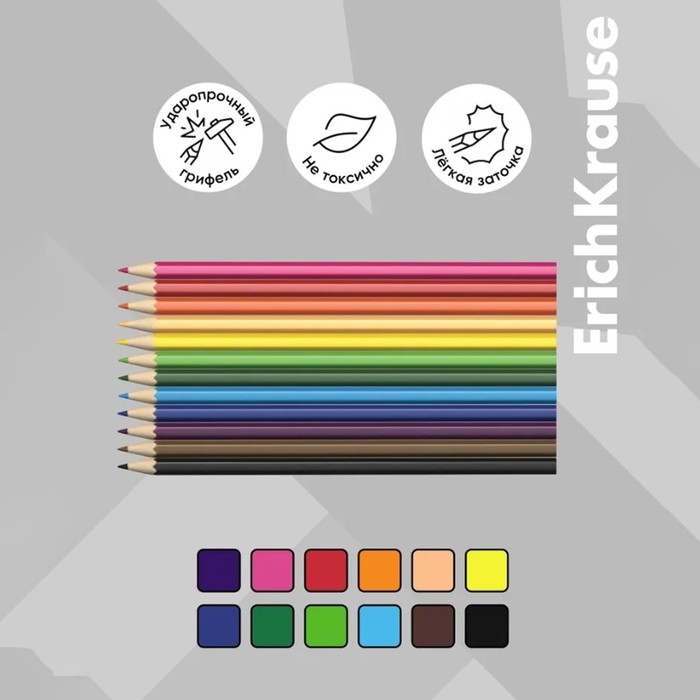 Карандаши 12 цветов ErichKrause Basic, дерево, шестигранные, 2.6 мм грифель, картонная упаковка, европодвес