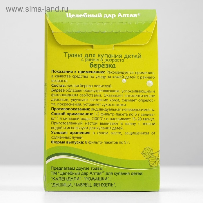 Рекомендуется применять в качестве средства по уходу за кожей детей с раннего возраста. Травяные ванны с листьями березы бережно ухаживают за нежной кожей ребенка, оказывают бактерицидное и заживляющее действия, снимают воспаления и покраснения, избавляют от потнички и опрелостей. Оказывают антисептическое действие, снимают опрелости, покраснения, устраняют сухость кожи. Форма выпуска очень удобна в применении, не требует процеживания, доставляет максимум удовольствия и пользы.