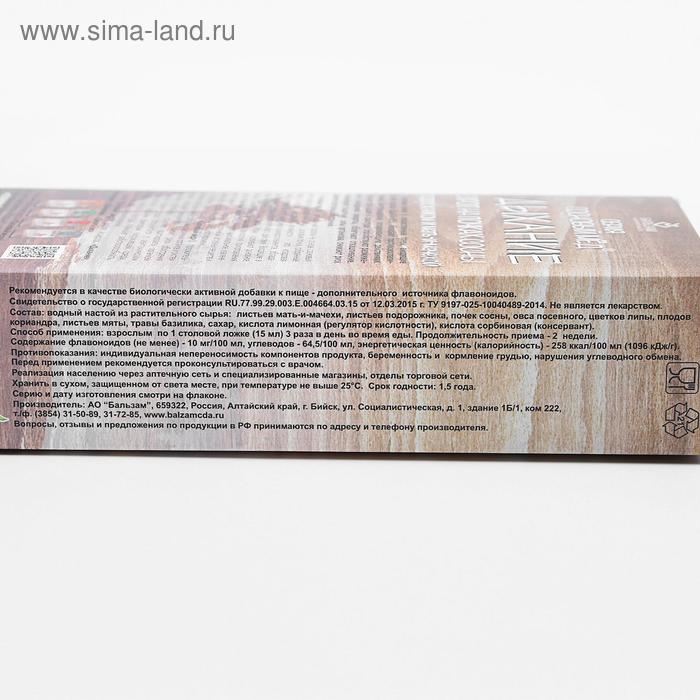 Сироп «Дыхание» - натуральный продукт на основе сосновых почек и лекарственных растений Алтая, улучшающий функциональное состояние органов дыхания. Противовоспалительную и антисептическую активность в отношении слизистой дыхательных путей обеспечивают дубильные вещества, эфирные масла и флавоноиды, содержащиеся в сосновых почках, мяте, липе, подорожнике, мать-и-мачехи, базилике. Ментол, входящий в состав эфирного масла мяты, обладает спазмолитическим и успокаивающим свойствами, способствует расслаблению гладкой мускулатуры бронхов, расширению их просвета и устранению отечности. Биологически активные вещества сосновых почек, мать-и-мачехи, подорожника, липы оказывают отхаркивающее действие, способствуют разжижению и выделению мокроты, облегчают откашливание, стимулируют регенерацию поврежденных тканей. Применение сиропа способствует отхождению мокроты, уменьшению частоты кашля и дискомфорта дыхания, улучшает общее самочувствие.