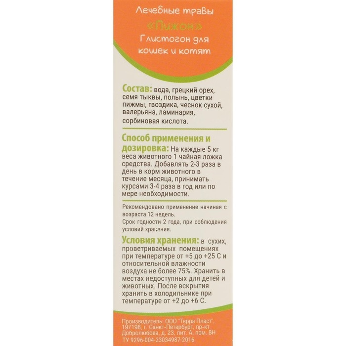 Лечебные травы "Пижон" глистогон, для кошек, 50 мл
