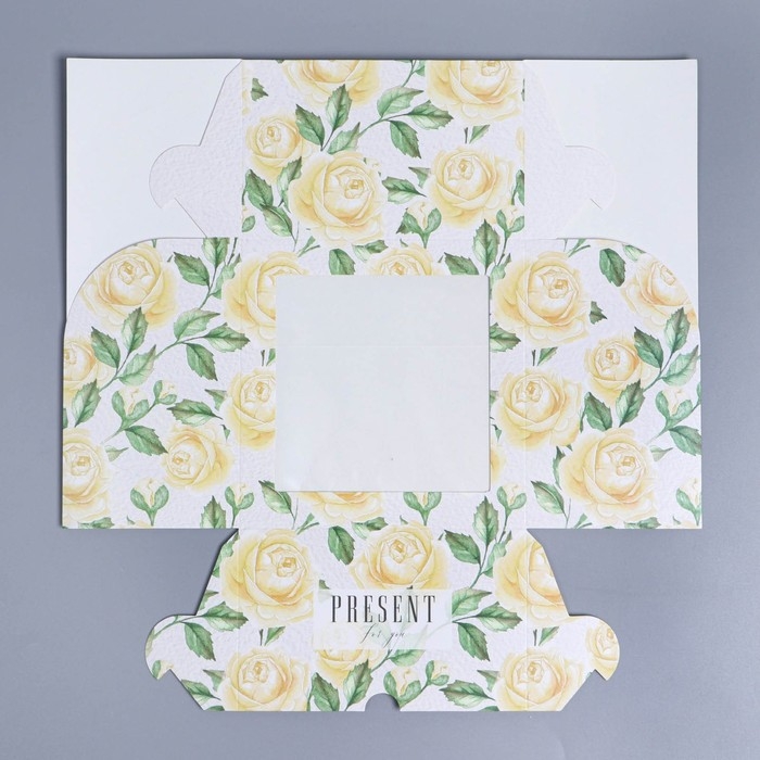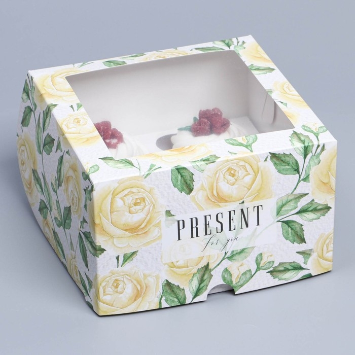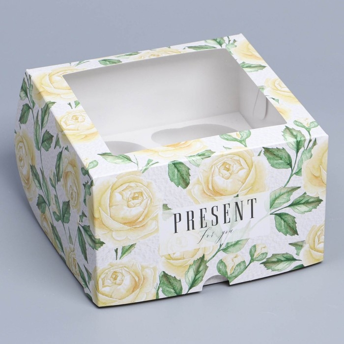 Коробка для капкейков, кондитерская упаковка с окном, 4 ячейки «Белые розы», 16 х 16 х 10 см