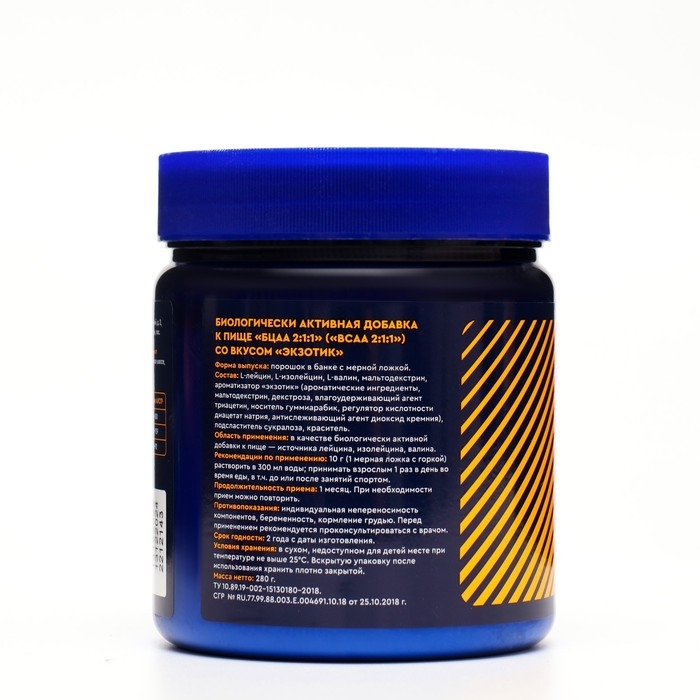 Состав: 10 г порошка содержат: L-лейцин — 3,4 – 4,6 г; L-изолейцин — 1,7 – 2,3 г; L-валин — 1,7 – 2,3 г. Вспомогательные вещества: мальтодекстрин, ароматизатор «экзотик» (ароматические ингредиенты, мальтодекстрин, декстроза, влагоудерживающий агент триацетин, носитель гуммиарабик, регулятор кислотности диацетат натрия, антислеживающий агент диоксид кремния), подсластитель сукралоза, краситель.