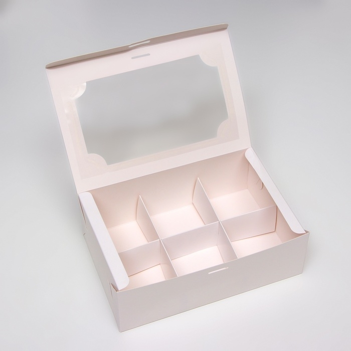 Внутреннее пространство разделено на шесть ячеек, что позволяет удобно разместить каждое пирожное или капкейк отдельно.