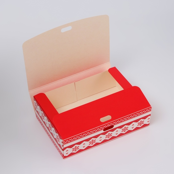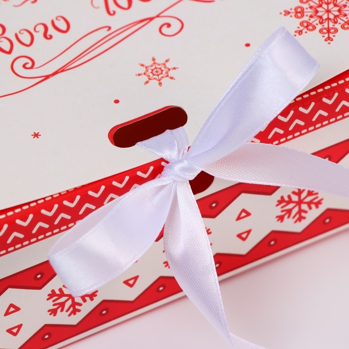 - Коробка выполнена в ярких новогодних цветах, что придает ей праздничный вид.