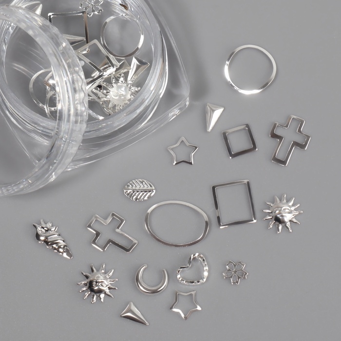 Добавьте изюминку вашему маникюру с объёмными металлическими декоративными элементами от бренда Queen fair! Эти серебристые фигурки станут идеальным акцентом для любого дизайна, придавая ногтям утончённость и оригинальность. Каждая фигурка выполнена из металла, что делает их удобными в использовании и долговечными.