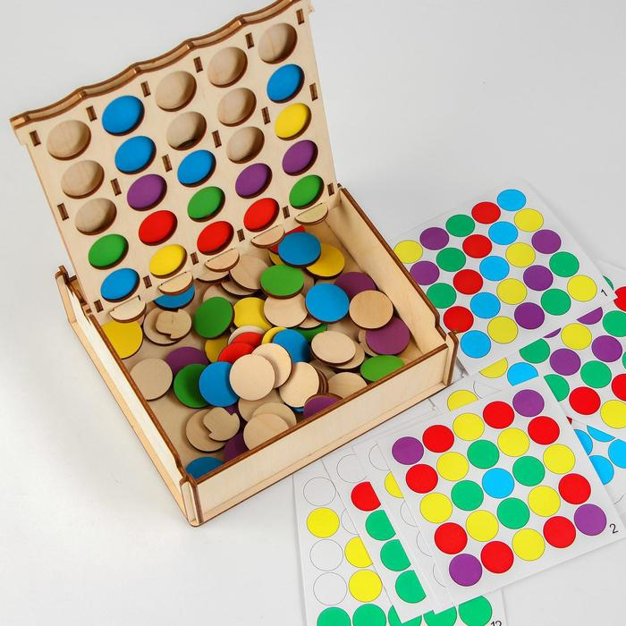 Попросите ребёнка поместить фишки в игровую панель в определённой последовательности, предложенной на карточках-заданиях (переворачивайте фишки не нужного цвета для заполнения фона).