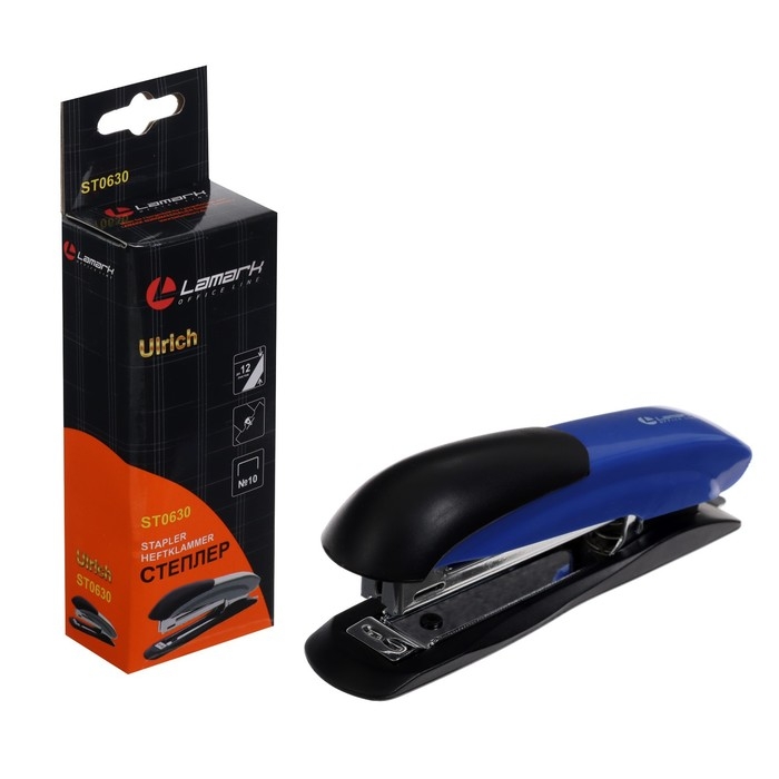 Степлер Lamark Ulrich №10, металлический корпус, встроенный антистеплер, индикатор скоб, до 12 листов, синий