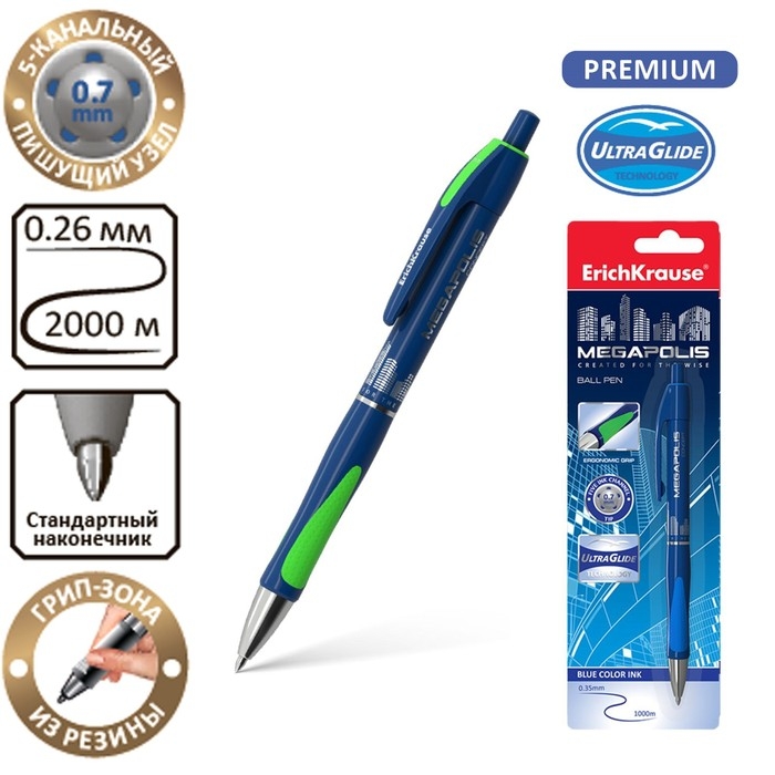 Автоматическая шариковая ручка Matic&Grip с металлизированными элементами, стандартным типом пишущего узла, заменяемым стержнем и уникальной технологией Ultra Glide. Ручка имеет круглый глянцевый корпус с эргономичной грип-зоной, оснащенной двумя резиновыми вставками. Цвет корпуса соответствует типу чернил. 5-канальный пишущий узел с диаметром шарика 0.7 мм в сочетании с чернилами пониженной вязкости обеспечивает мягкое и быстрое письмо без усилий. Длина непрерывной линии составляет 1000 м при толщине 0.35 мм, что является высоким показателем в своей категории. Модель MEGAPOLIS® Concept имеет узнаваемую запатентованную форму, обладает великолепной эргономикой и стала абсолютным бестселлером в ассортименте автоматических шариковых ручек ErichKrause® более чем в пятидесяти странах мира.
