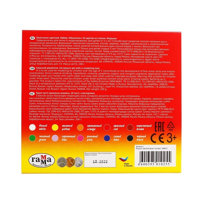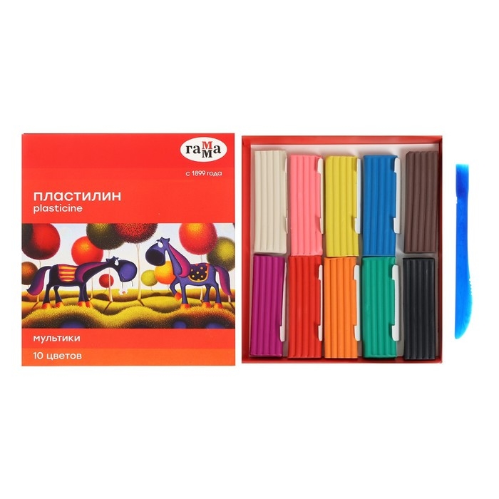 Пластилин 10 цветов 200 г, Гамма "Мультики", со стеком, картонная упаковка 280017