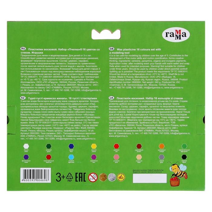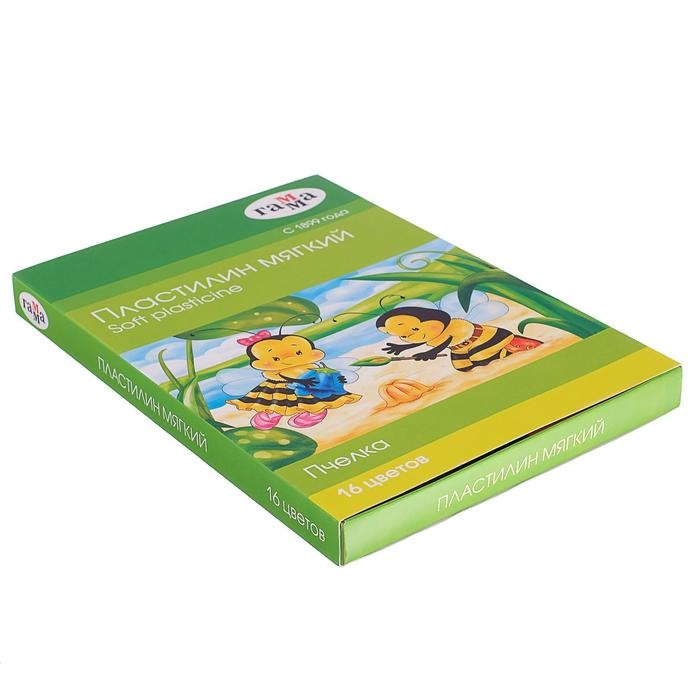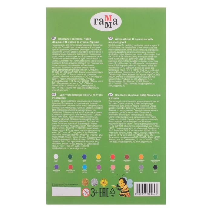 Пластилин мягкий (восковой) 16 цветов 196 г Гамма "Пчелка", со стеком, картонная упаковка 280030Н